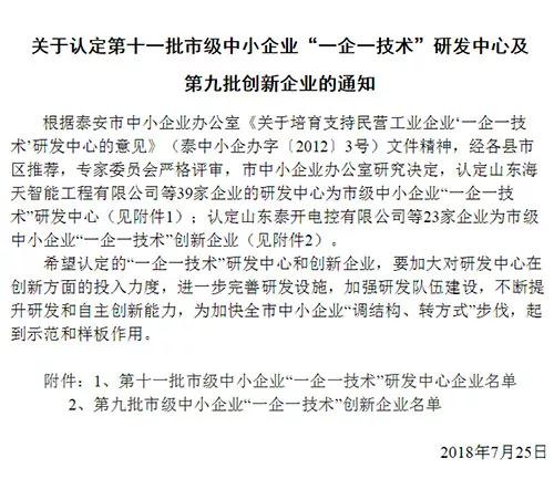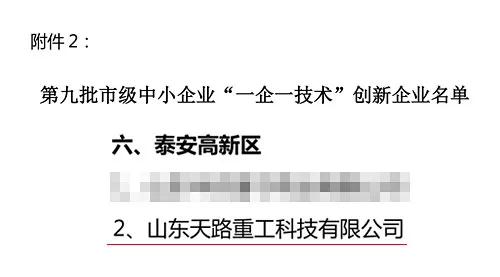 近日,根據泰安市中小企業(yè)辦公室《關于培育支持民營工業(yè)企業(yè)‘一企一技術’研發(fā)中心的意見》及相關文件精神,山東天路重工科技有限公司被認定為市級中小企業(yè)“一企一技術”創(chuàng)新企業(yè)。